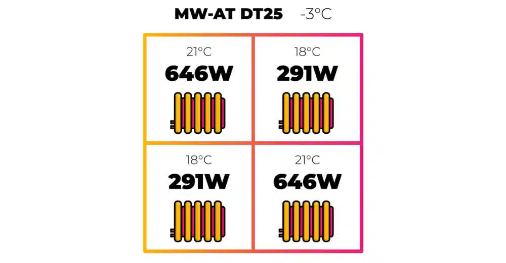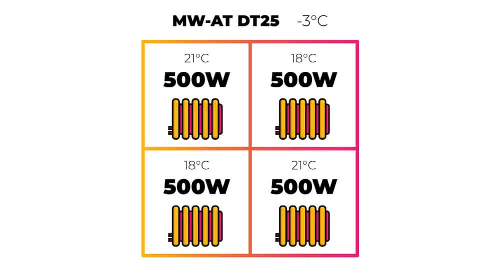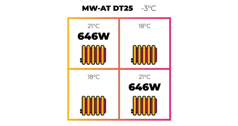 So the ΔT 25 radiator, which produces 500 W, now has to output 646.4 W (500 + 146.4).