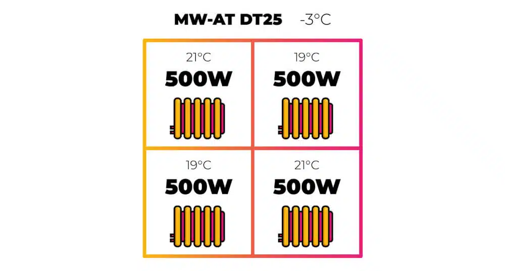Multiply these together and you’ll see that the new load would theoretically be 1874 W if all rooms had similar heat loss.