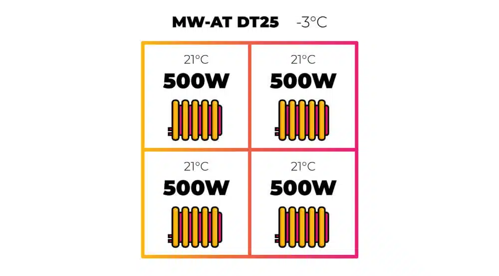 Let's take this four-room house. To keep the maths simple, each room has a 500 W heat loss at design outside temperature of −3 °C — or 2 kW in total — with a room temperature of 21 °C. Each room is fitted with a mean water-to-air temperature (ΔT 25) radiator, meaning each radiator will output 500 W when its average surface temperature is 25 °C above the room temperature.