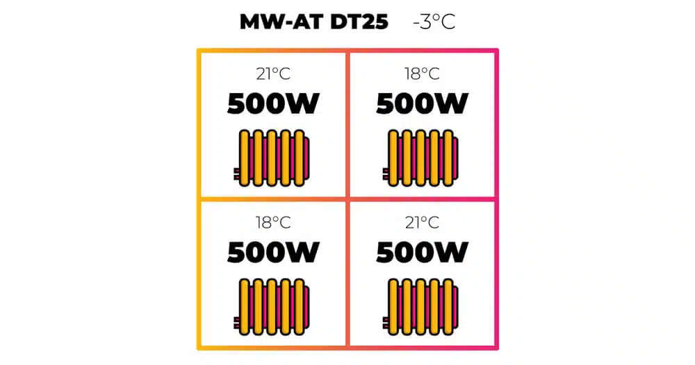 Now, with a 21°C room temperature, our mean water temperature would have been 46°C at the design outside temperature. However, it will now need 51.5 degrees celsius.